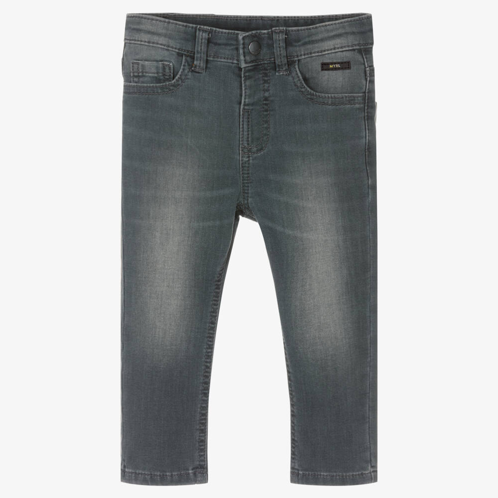 Faded grey slim fit jeans for little boys by Spanish brand Mayoral, with five-pocket styling and a washed and worn look. Made in comfortable, stretchy, sustainable cotton denim, they have an adjustable waist for a great fit.