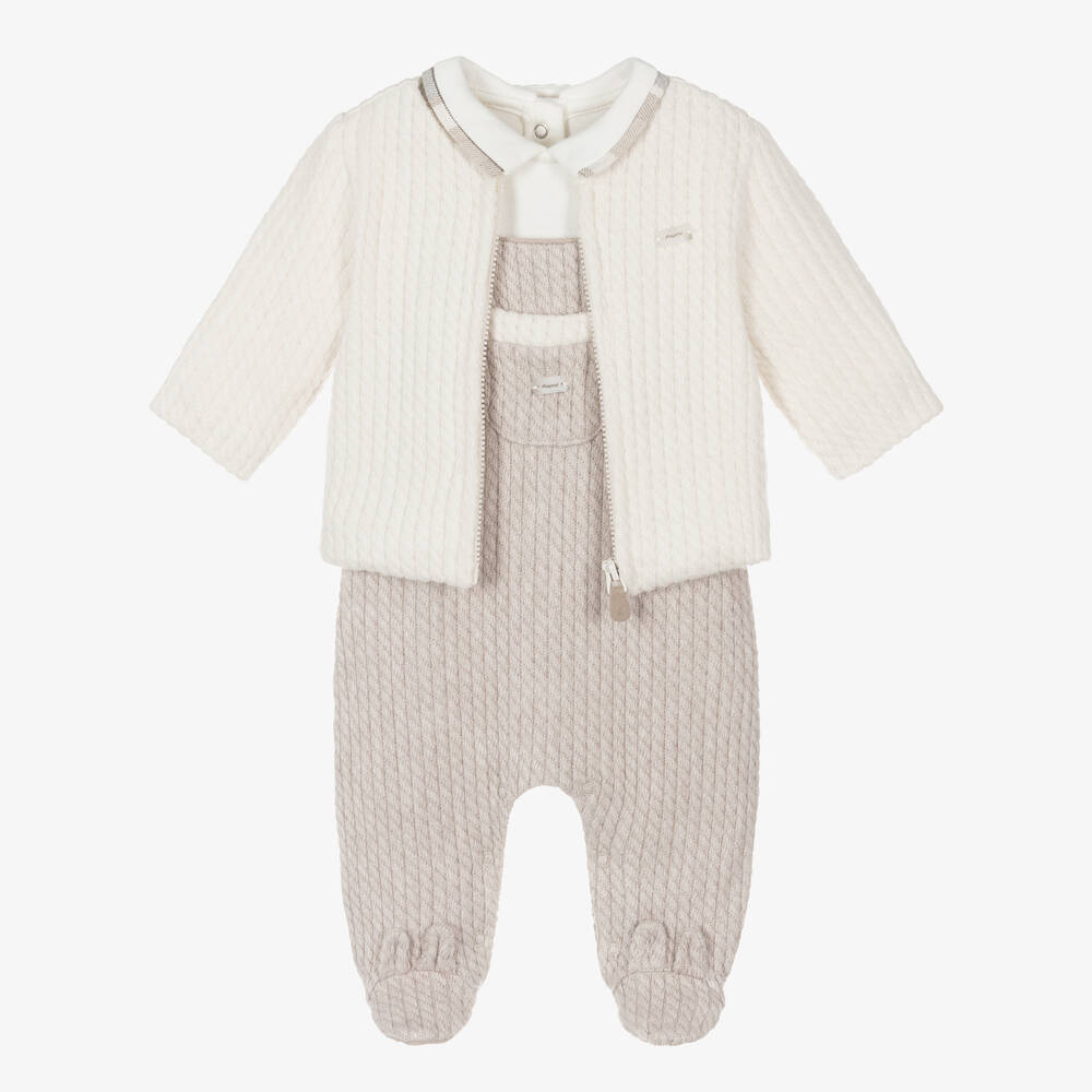 Ivory zip-up top and beige babysuit set for boys from Mayoral, in super soft knitted jersey with a lovely cable pattern. The babygrow is designed to look like dungarees with an ivory long-sleeved 'top' and sweet collar detail. The front pocket has a logo tab and the enclosed feet have little 3D ears. There are popper fastenings on the back and between the legs. The ivory, round-neck top is lined in soft cotton jersey and fastens easily with a zip.
