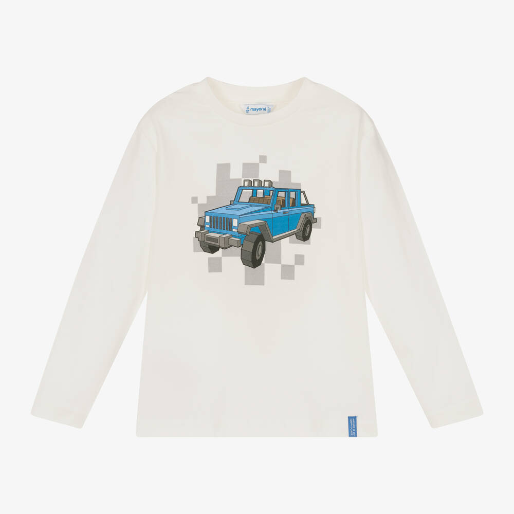 Ivory long-sleeved top for boys by Mayoral, made in soft cotton jersey with a cosy brushed feel. Casual and comfortable to wear, it features a blue and grey jeep motif on the front. It has a classic ribbed crew neck and a small tab on the hem with the words 'Nature Is My Happy Place'.