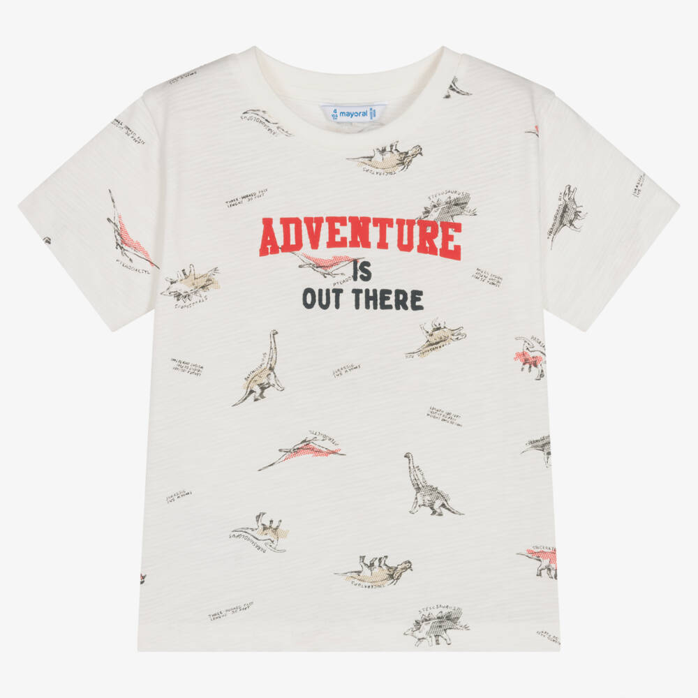 Cool ivory cotton T-shirt for boys by Spanish brand Mayoral, with an adventure theme and dinosaur prints in black and red. Ideal for casual wear, it is made in comfortable slub jersey.