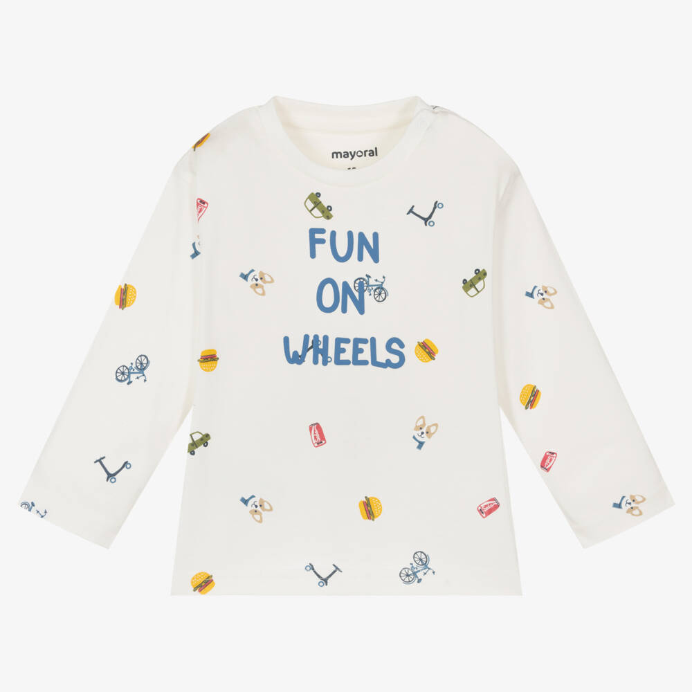 Ivory top for little boys by Mayoral, made from soft cotton jersey. Ideal for casual wear, this long-sleeved top has a blue 'Fun on Wheels' slogan on the front to accompany the car, animal and food-themed print. There are popper fastenings on one shoulder for easy dressing.