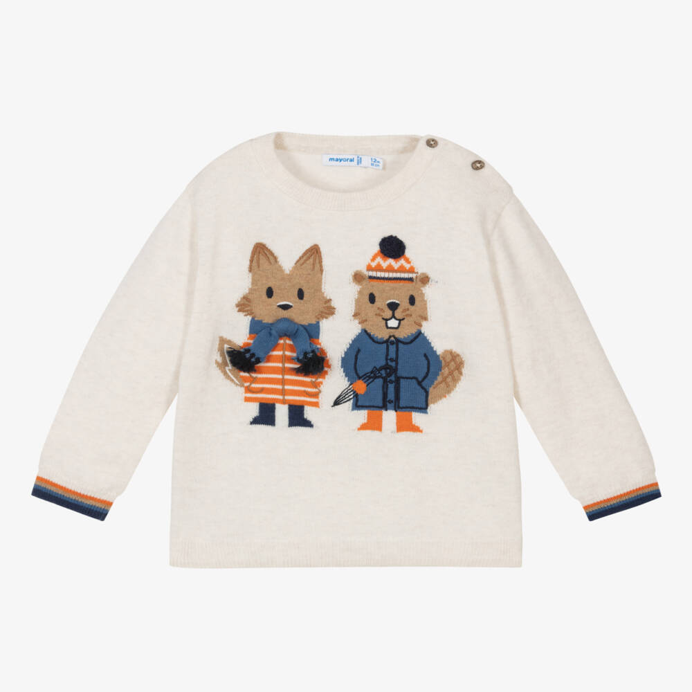 Ivory sweater for little boys by Spanish brand Mayoral, finely knitted in a soft cotton and wool blend. Ideal for layering, it has a rounded neckline and lightly ribbed cuffs with orange, beige and blue stripes. There is a fun intarsia knit fox and beaver design on the front wearing a 3D scarf. Wooden button fastenings on the shoulder help with dressing.