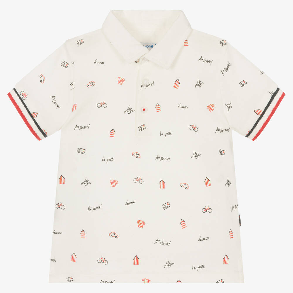 Fun ivory polo shirt for little boys by Spanish brand Mayoral, made in the softest cotton piqué. It is patterned in a bike, postcard and beach hut design, with summery French words printed all-over. For comfort and style, it has blue, white and red ribbed trims, with branded button fastenings on the front.