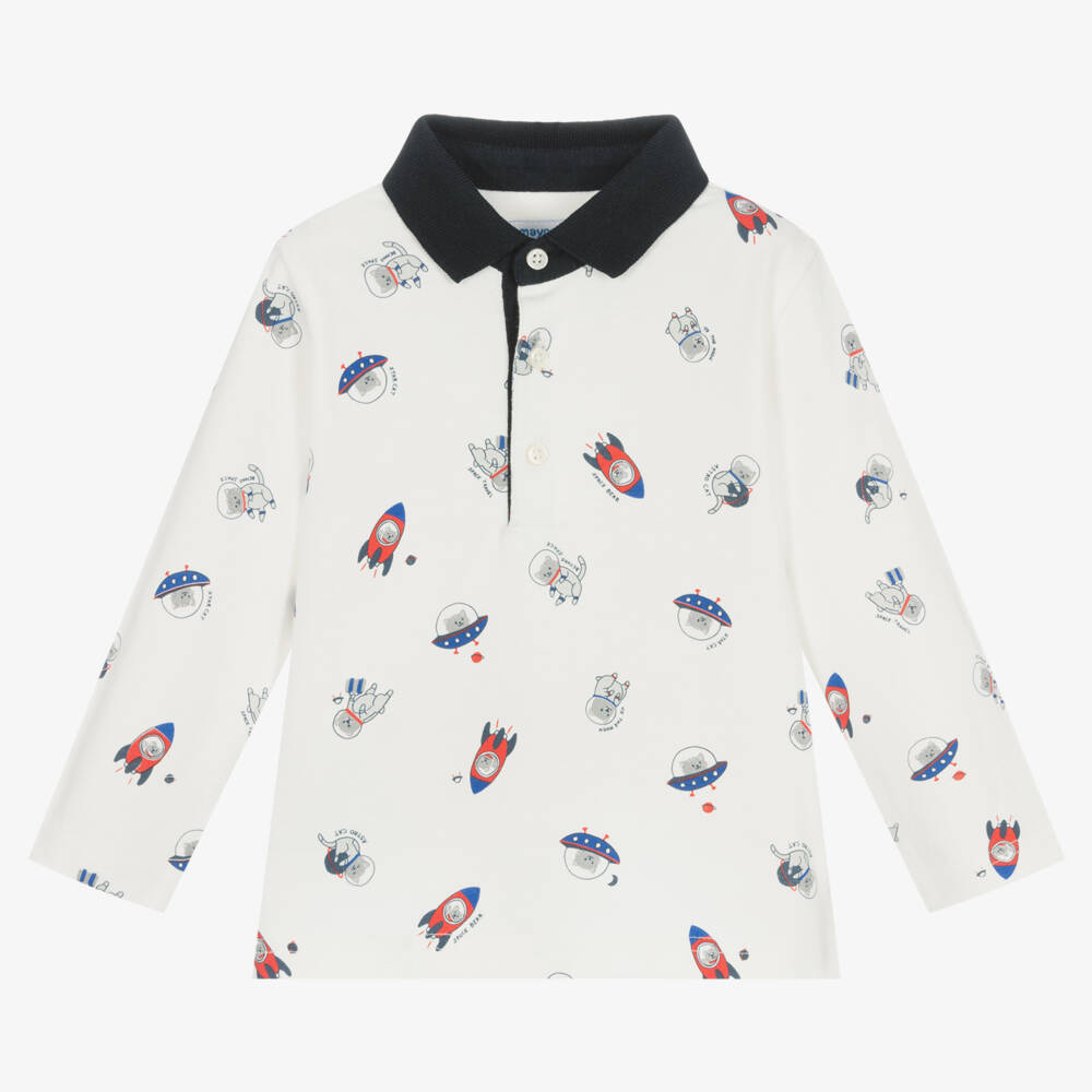 Ivory rugby shirt for little boys by Mayoral, made in soft and comfy cotton jersey. It is patterned in a sweet print of animal astronauts and space rockets. There is contrasting navy blue collar and front button fastenings.