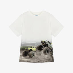 Ivory T-shirt for boys by Mayoral, made in soft jersey. This casual tee features an exciting monster truck print in grey and yellow that wraps around the front and onto the back.