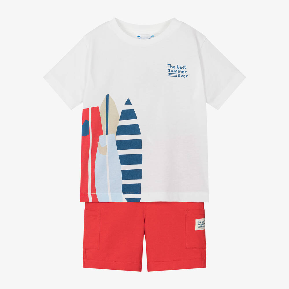 Ivory and red shorts set for boys by Mayoral, made in soft cotton jersey for casual comfort. The short-sleeved tee has a 'The Best Summer Ever' slogan printed on the chest, alongside a free-spirited surfboard graphic. The red drawstring shorts complete the set with comfort and have a matching slogan badge on one front pocket for a coordinated look.