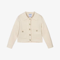 A dark ivory jacket for little boys by Mayoral, made in soft sherpa fleece, with smooth front and back panels. Lined in soft fleece for warmth and comfort, this cosy jacket has a stand-up collar and front patch pockets. It has contrasting brown trims and fastens easily with a zip.
