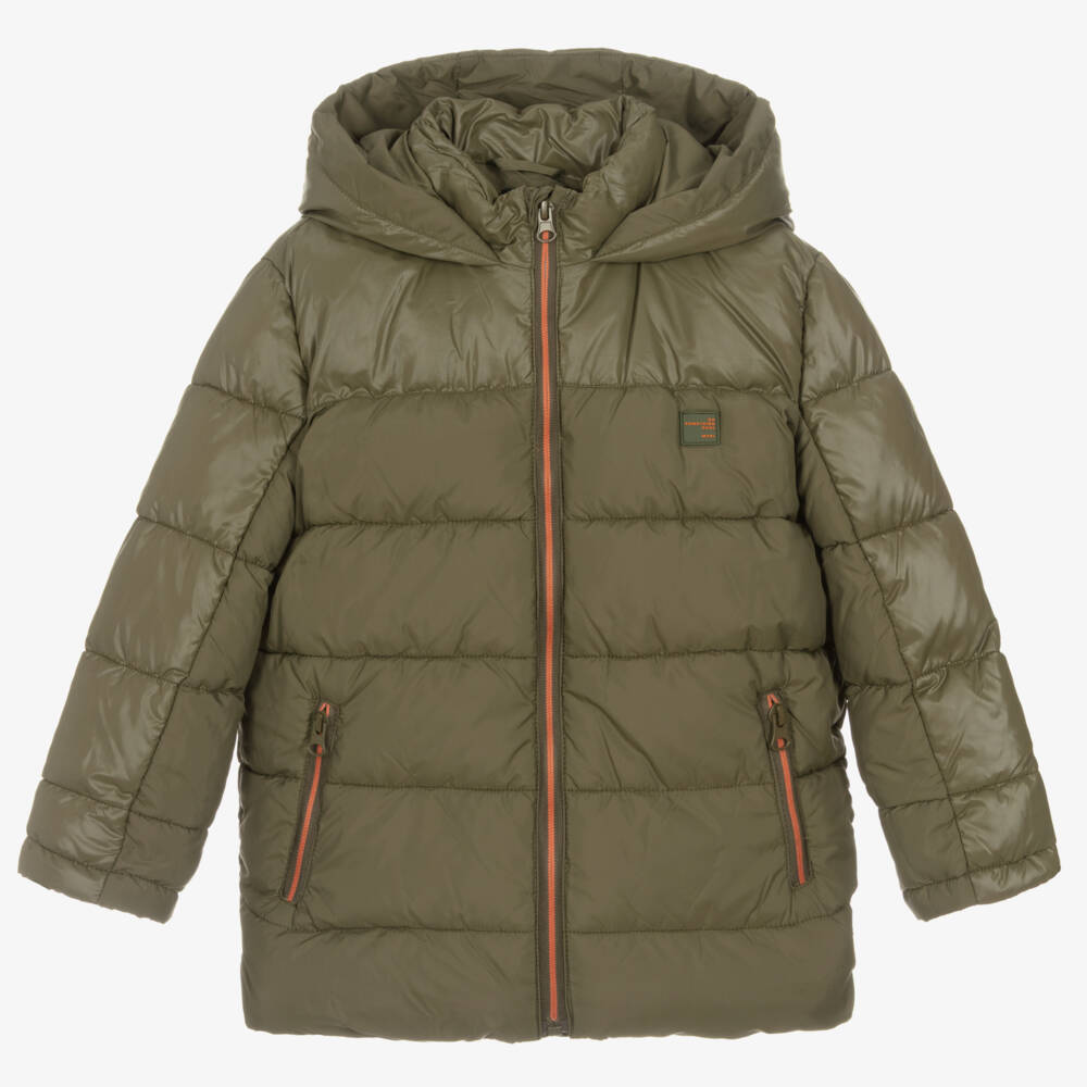 Matte khaki green hooded puffer coat for boys by Mayoral. It is made in silky-smooth fabric, with high-shine panels across the shoulders and down the sleeves for a multi-textured finish. There are two useful pockets on the front, with orange trims on the zips for added splashes of colour. Comfortable and cosy, it is lined with soft polar fleece and padded with medium-weight insulation.