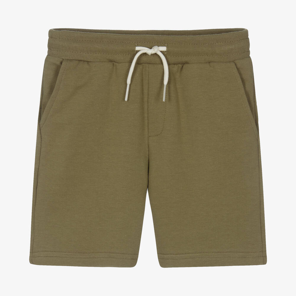 Khaki green jersey shorts for boys by Mayoral, in a soft cotton blend. The waistband is elasticated with a drawstring tie for an adjustable fit and they have three useful pockets with a discreet logo patch on the back.