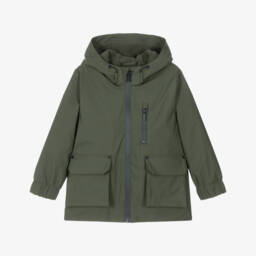 Stylish and practical, this khaki green zip-up raincoat for boys is by Mayoral. Silky smooth on the outside, it has a polar fleece lining for added warmth and comfort. The elasticated cuffs and fixed hood provide extra protection against the elements, and there are useful flap pockets on the front, with an additional zipped pocket on the chest.