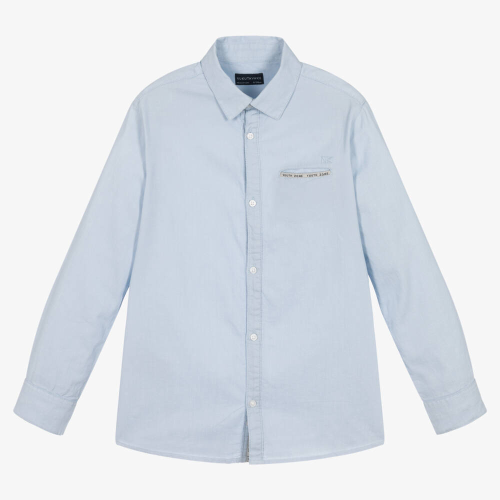 Light blue shirt for older boys by Mayoral Nukutavake, woven from a lightly textured cotton fabric. Classic in style, it has a point collar, front button fastenings and barrel cuffs. Tonal logo embroidery can be seen on the chest and a 'Youth Zone' slogan trims the pocket below.