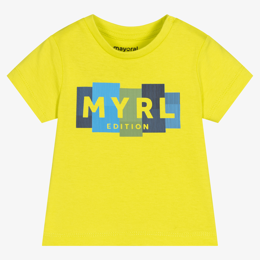 Little boys lime green sustainable cotton T-shirt by Mayoral, with a blue striped logo printed on the front and popper fastenings on the shoulder.