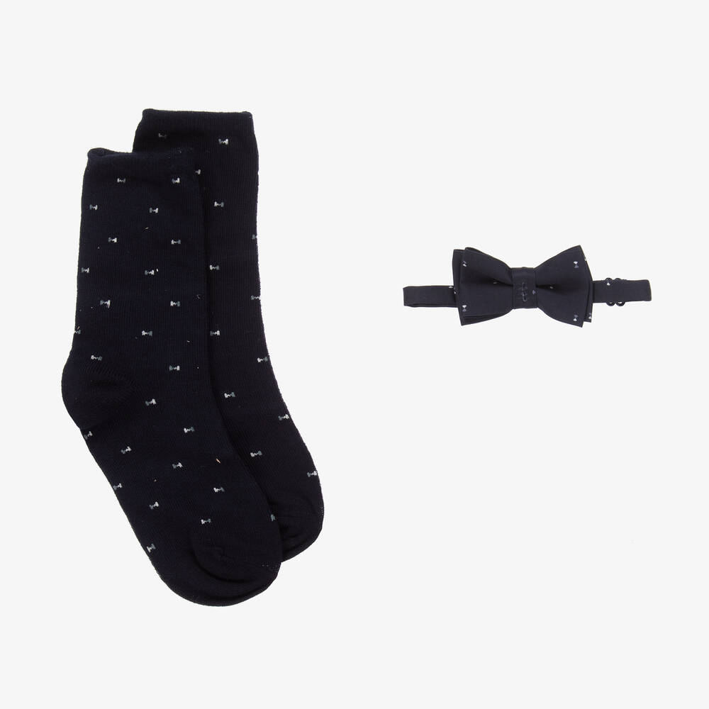 Navy blue bow tie and socks set for boys by Mayoral, ideal for adding a coordinating touch to any outfit. The bow tie is made in smooth satin and is patterned with tiny white and grey bows. It has an elasticated, adjustable strap which fastens with velcro for comfortable wear. The cotton-rich ankle socks have a tiny white and grey 'M' pattern and softly ribbed cuffs.