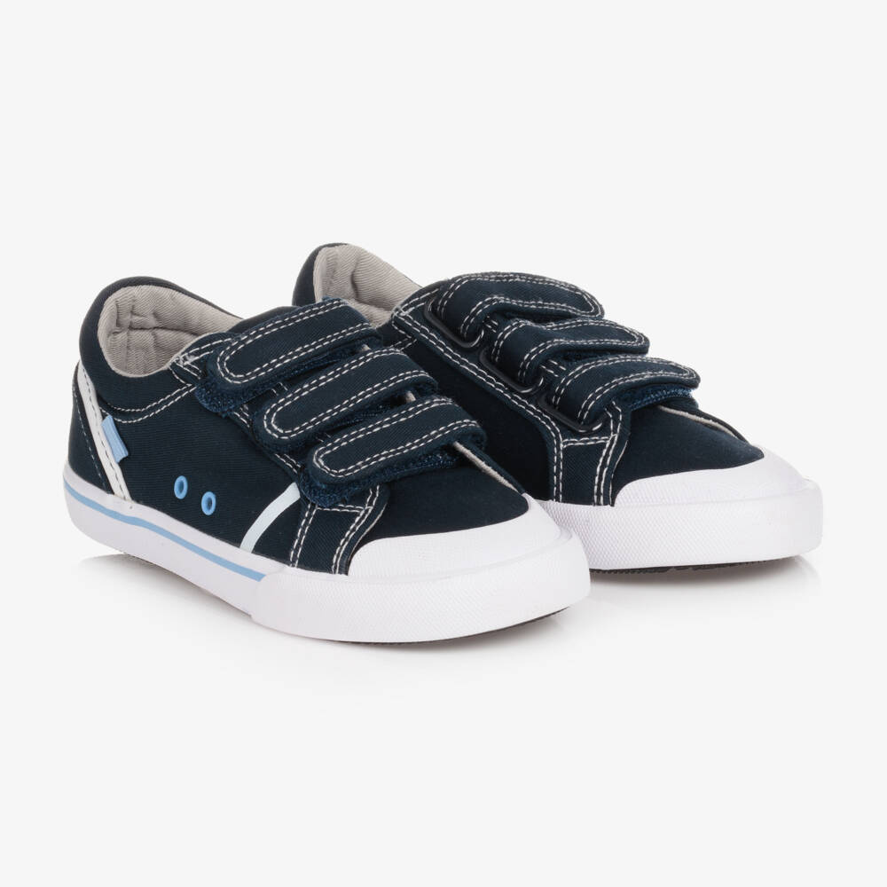 Navy blue low-top trainers for boys by Mayoral, made in soft cotton canvas. The uppers have stylish, contrast white stitching and fasten with useful velcro straps. For comfort, they have a padded insole and textile lining. The rubber white outer sole have a blue stripe for a sporty look, and non-slip ridges for extra grip.