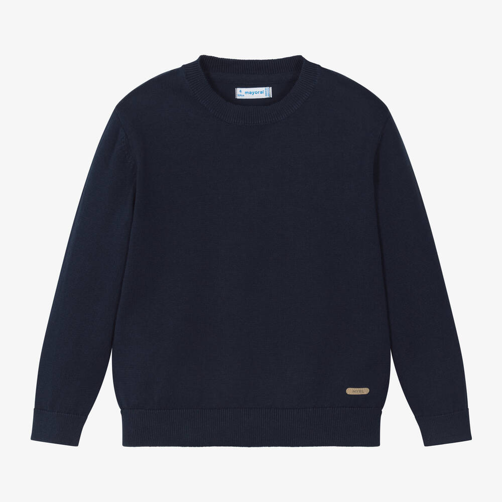Navy blue cotton sweater for boys by Spanish brand Mayoral, finely knitted in soft cotton. Great for layering, this lightweight top has comfortable ribbed trims and a beige, faux leather logo patch sewn by the hemline.
