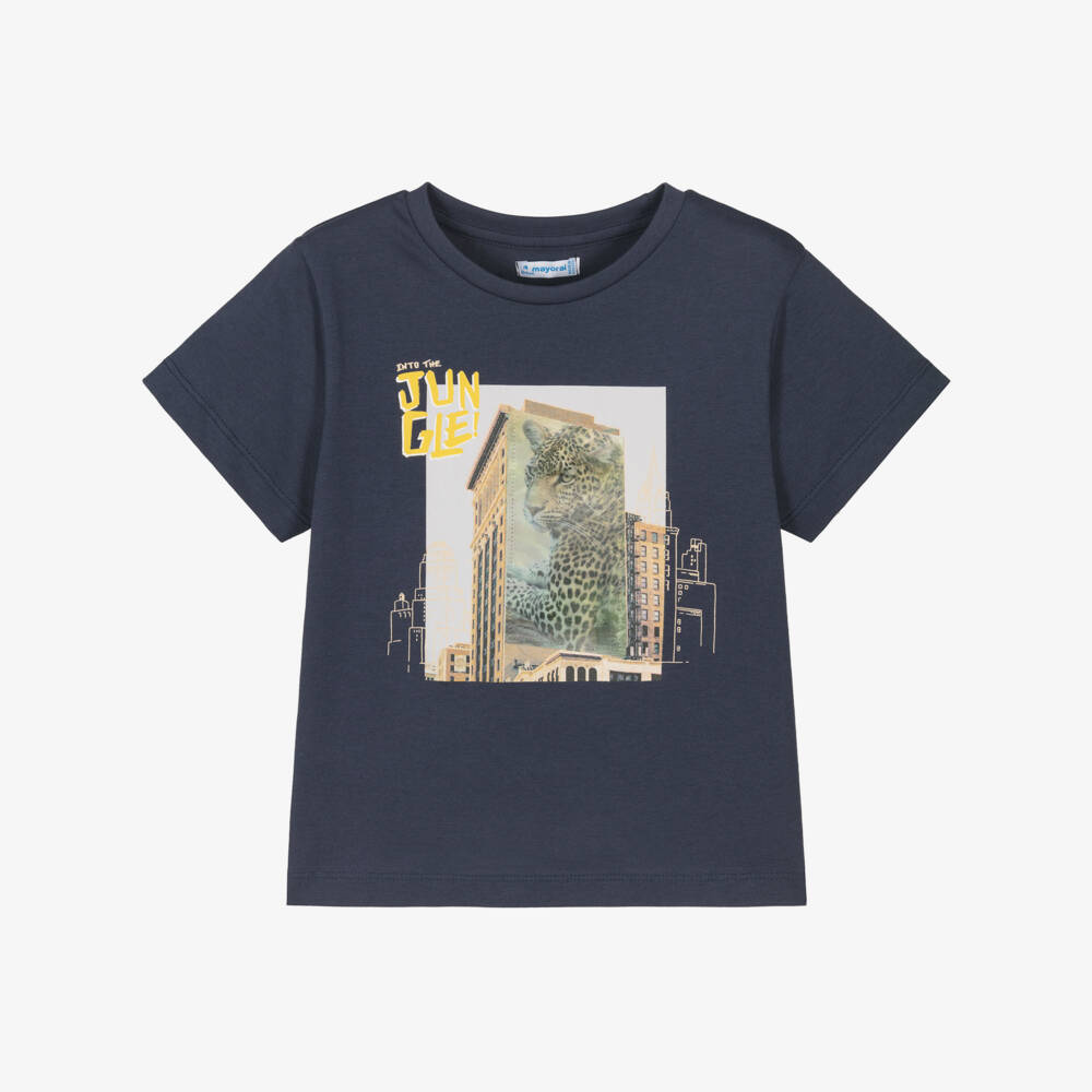 Fun navy blue cotton T-shirt for older boys by Mayoral, made in comfortable jersey. It has a beige and green cityscape print, with a lenticular motif of a jungle on the side of one building, which changes to a leopard with movement.