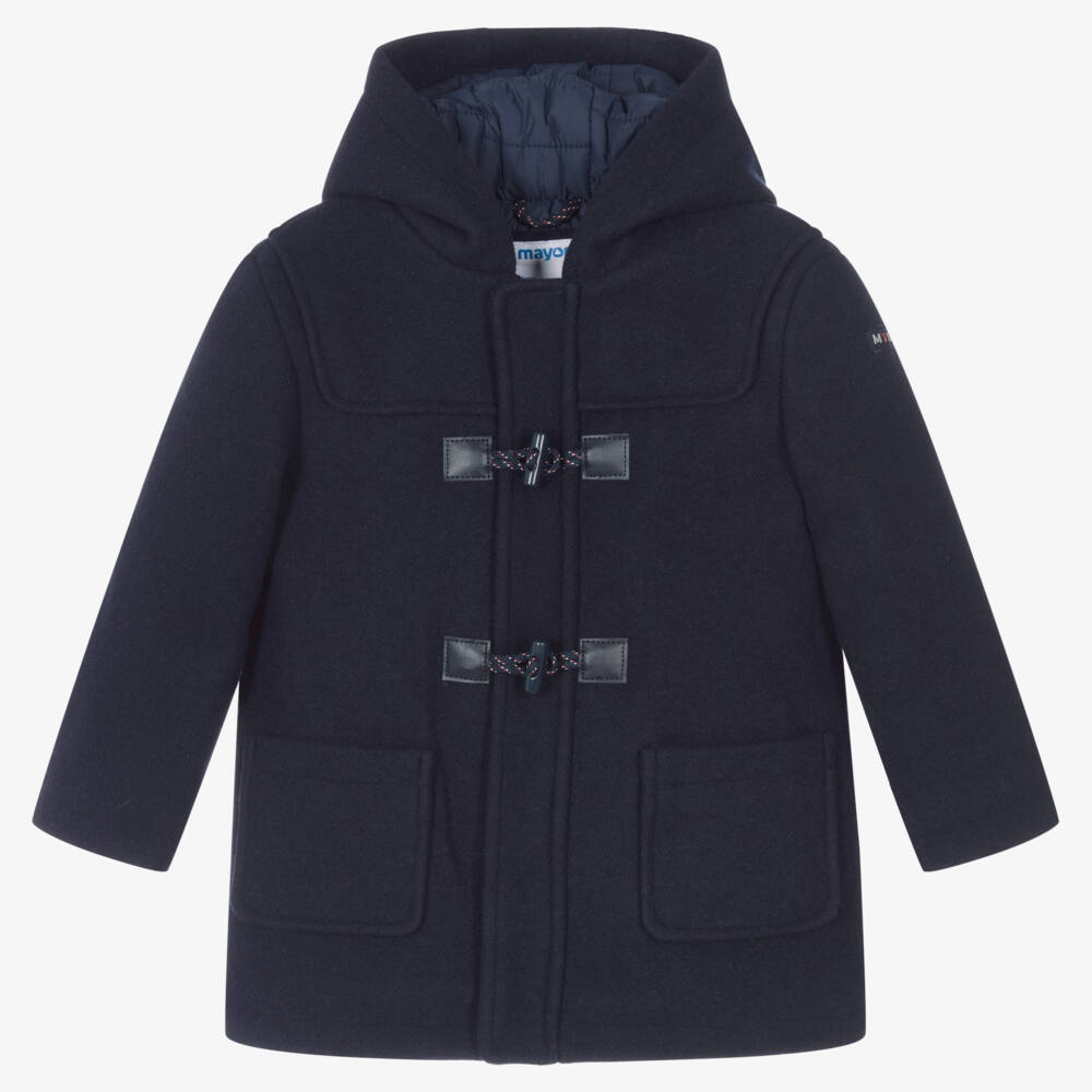 Little boys navy blue duffle coat by Mayoral, made in mid-weight polyester flannel. It has all the traditional features of a duffle coat, including the toggle fastenings with a zip beneath. There is a navy blue rubber logo patch on one sleeve. It has a silky navy blue nylon lining and lightweight polyester padding for added warmth.
