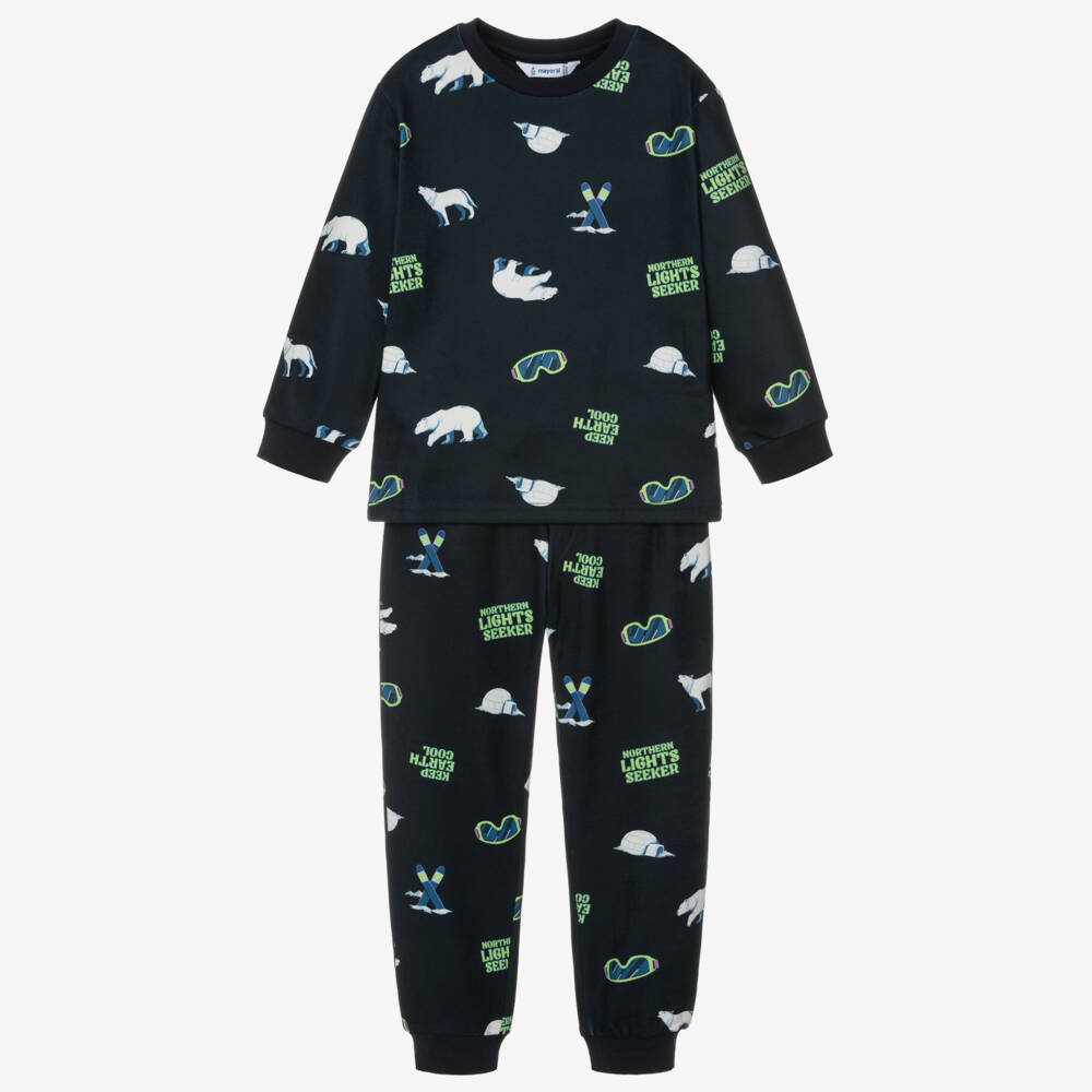 Cool navy blue pyjamas for boys by Mayoral, made from super soft microfleece. They have a fun ski-themed polar bear print and ribbed trims. The pyjama bottoms have a comfortable elasticated waistband with bright green drawstring ties.