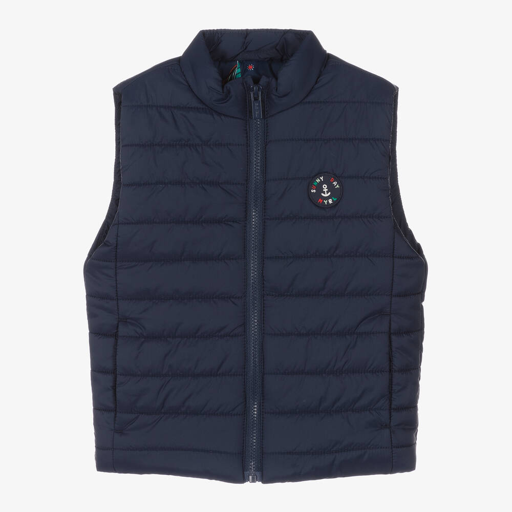 Navy blue puffer gilet for little boys by Mayoral. Soft, silky and lightweight, it has front pockets and a colourful rubberised logo patch on the chest. Fastening wth a zip on the front, it is lightly padded and has a silky smooth lining patterned with colourful boats and lighthouses.