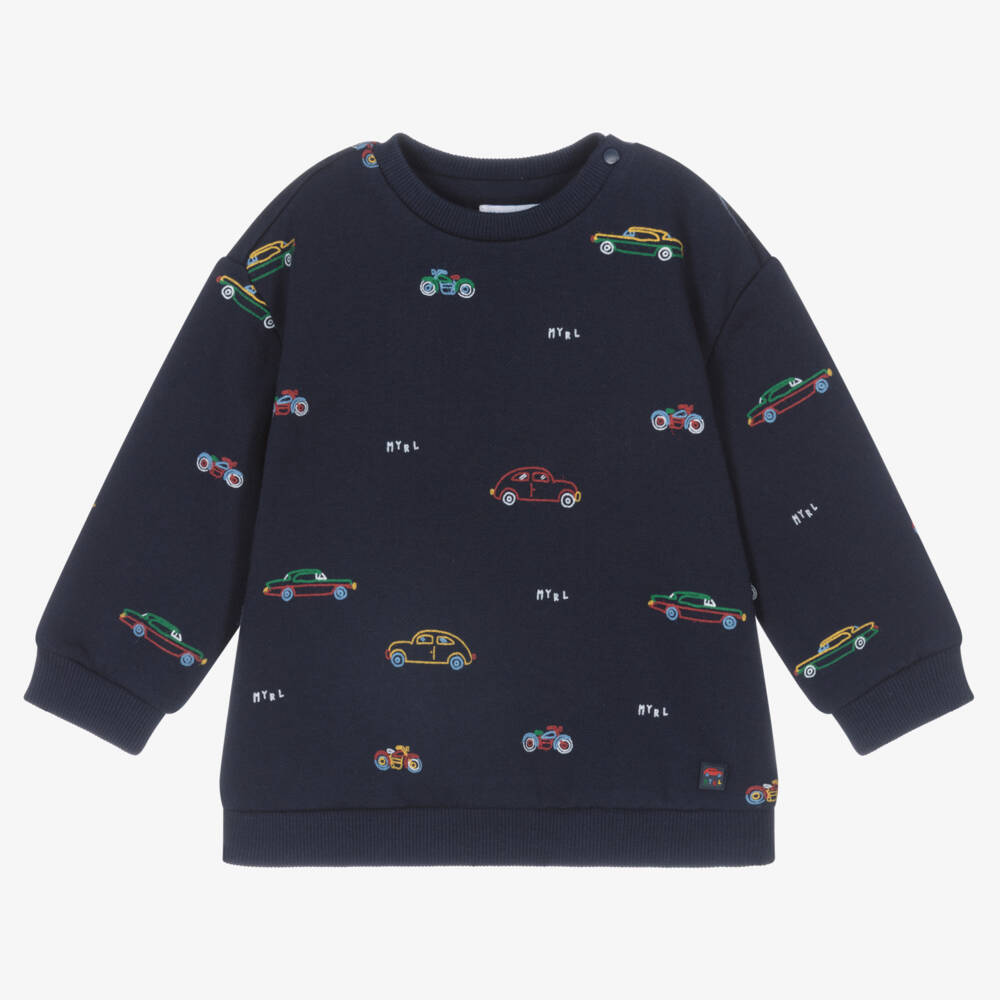 Navy blue sweatshirt for little boys by Mayoral, made in mid-weight cotton-blend jersey. It has a shoulder popper fastening and a colourful all-over vehicle print with white logo details.