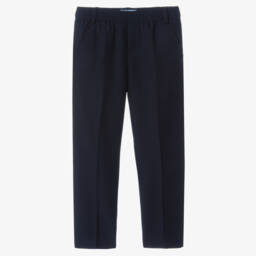 Smart navy blue trousers for boys by Mayoral, suitable for school wear. Made in soft twill, they have a comfortable elasticated waistband for easy wear, practical front pockets and a faux back pocket detail.