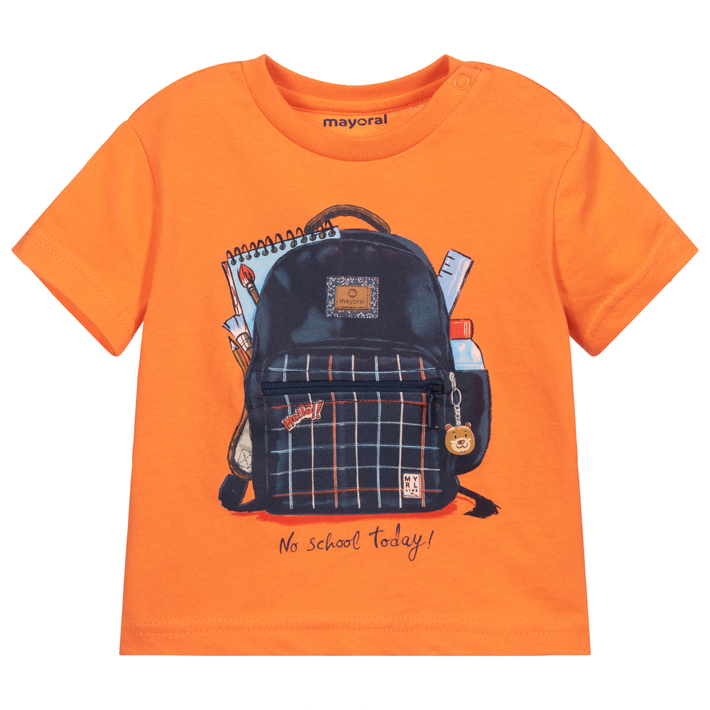 A fun orange T-shirt for little boys by Mayoral, made in soft cotton jersey. It has a navy blue slogan and backpack print with a functioning zip pocket. There are popper fastenings on one shoulder.
