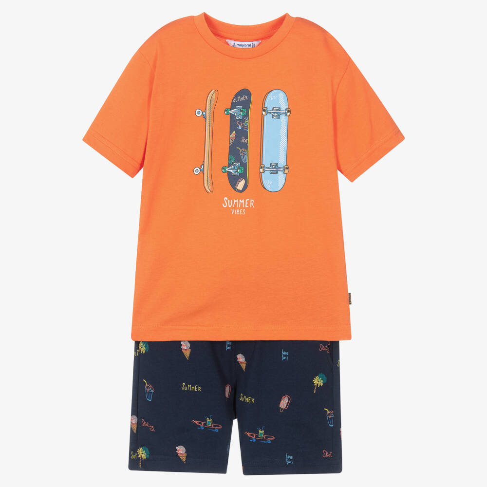 Boys orange and navy blue shorts set by Mayoral, made from soft sustainable cotton jersey. The bold orange T-shirt has a beige and blue skateboard print. The navy blue shorts have a beach-themed print, a drawstring waist and three useful pockets.