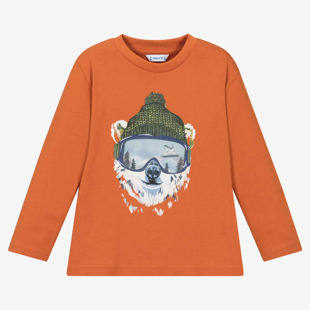 Great for casual wear, this burnt orange long-sleeved top for boys by Mayoral is made from soft cotton jersey. A cool polar bear head is printed on the chest, wearing ski goggles and a bobble hat. The lenses of the goggles are a lenticular patch, moving between an image of the northern lights to an image of a snowboarding polar bear for a unique effect.
