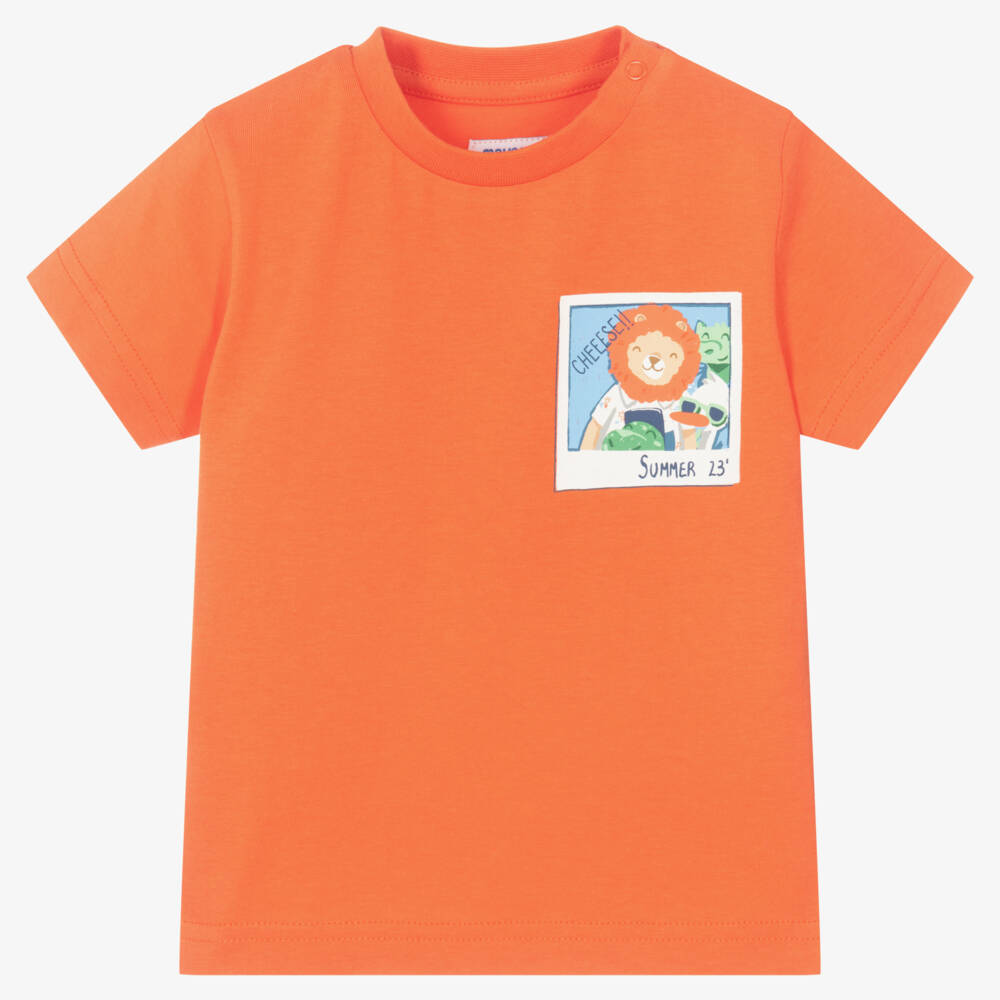 Orange sustainable cotton T-shirt for little boys by Spanish brand Mayoral. It has a print of animals smiling for the camera on the front and the Worlds best surf route on the back. Easy to wear, it is made in comfortable jersey, with popper fastenings on one shoulder.