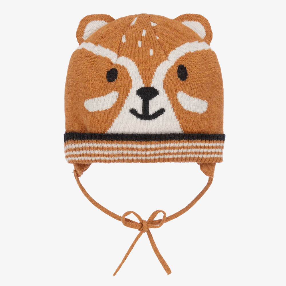 Warm and cosy orange hat for little boys by Mayoral, with cute fox features. It is knitted in a soft cotton and wool blend, with sweet little ears on top. There is a striped turned up brim, with knitted ties to secure under the chin,.