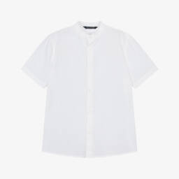 Pale blue shirt for older boys by Mayoral Nukutavake, made in cool, comfortable cotton with a subtle slubbed effect. ideal for warm weather, this smart-casual style is collarless and has short sleeves.