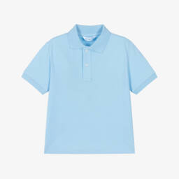 Stylish pale blue polo shirt for boys by Mayoral, made in soft and comfortable cotton piqué. This classic, sporty style has a ribbed collar and cuffs, branded button fastenings and a split hem. A tonal rubberised logo adds a subtle designer finish.