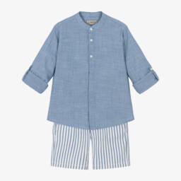 This blue shorts set by Mayoral is a smart choice for boys. Made in lightweight cotton, the grandad-collar shirt is cool and comfortable. The long sleeves can be rolled up and secured with a buttoned tab for a more casual look. The striped shorts have slanted front pockets and an adjustable waist for a great fit.