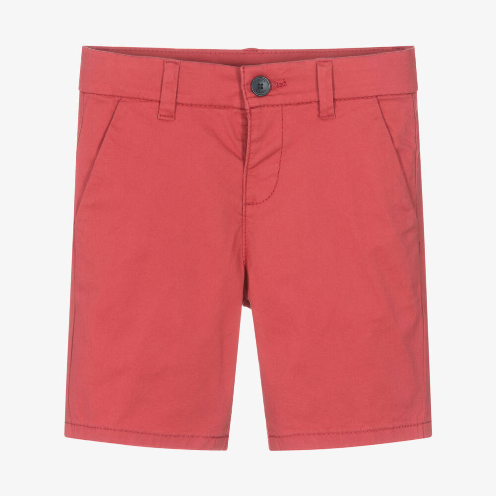 Red chino shorts for boys by Mayoral, made from soft twill with a slight stretch for comfort. Great for both smart and casual wear, they have slanted pockets and a branded button fastening on the front, with an adjustable waistband for a comfortable fit. There is a metal logo tab stitched above one of the back pockets for a discreet designer finish.