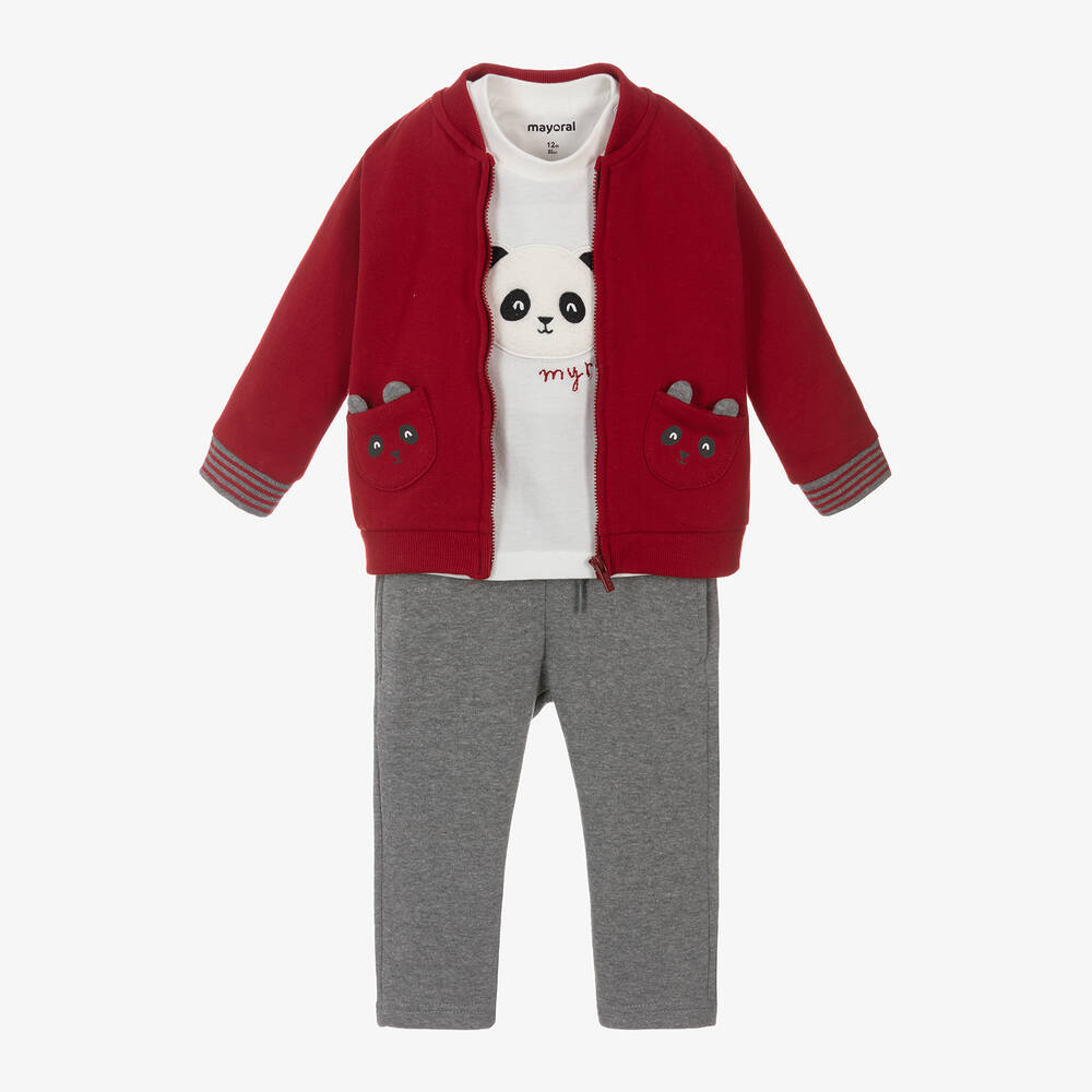 Fun, comfortable deep red and grey marl tracksuit set for little boys by Mayoral, made in soft cotton blend jersey. The zip-up top has cute patch pockets in a panda design with ear appliqués and contrasting grey striped cuffs. The coordinating joggers feature pockets on the side seams, a drawstring waistband for an adjustable fit and reinforced knees. Completing the set is an ivory long-sleeved top with a fluffy panda patch and shoulder popper fastenings.