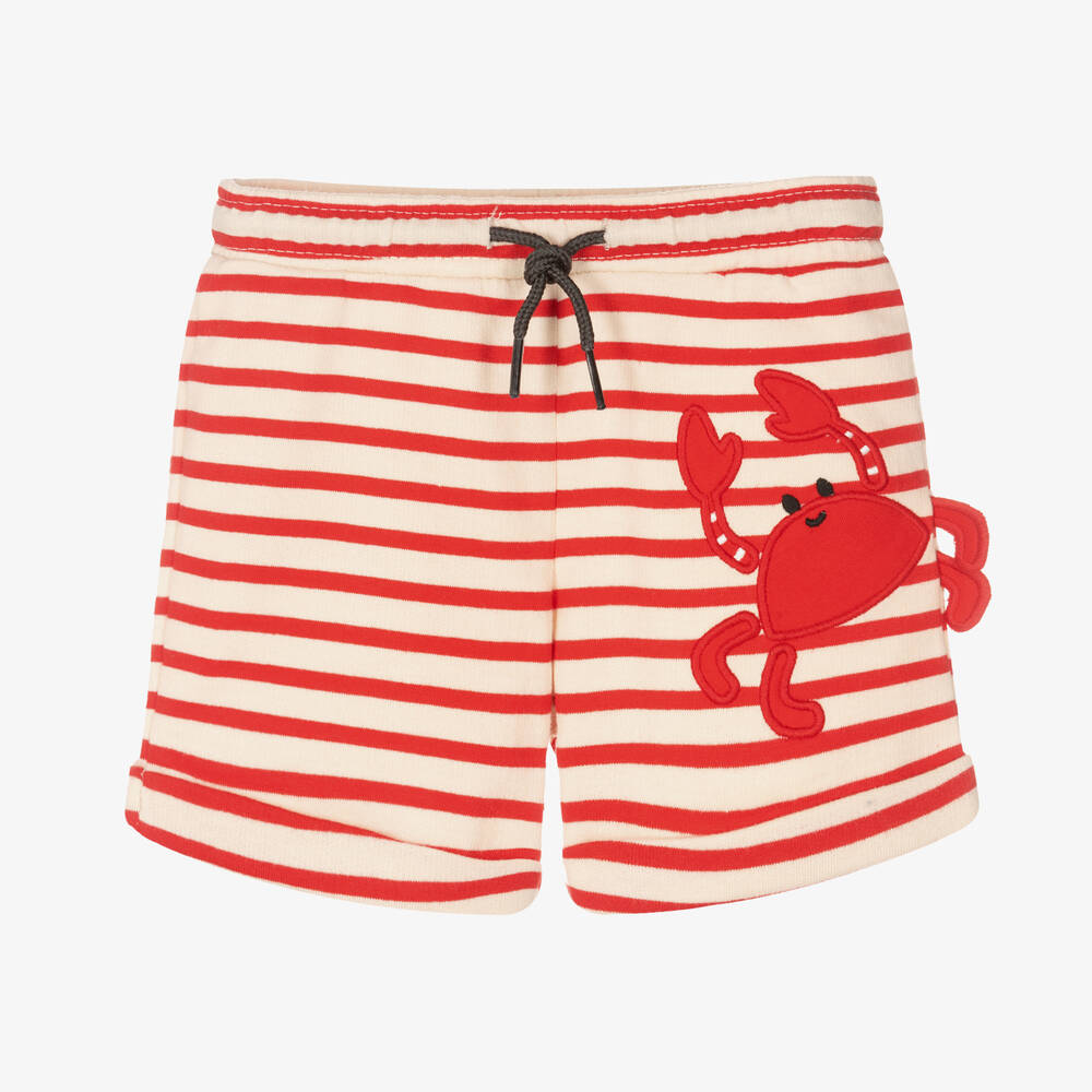 Adorable red and ivory shorts for little boys by Spanish brand Mayoral, made in the softest cotton blend jersey. They have a red embroidered fabric crab on the front, with legs appliquéd to the side and a pocket on the back. Designed to provide an ideal fit, they have an elasticated drawstring waistband.