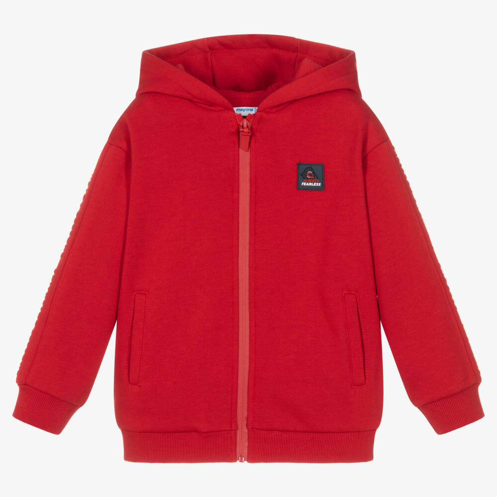 Red zip-up hoodie for boys from Mayoral. It is made in a soft, medium-weight cotton blend, with a race car-themed patch on the chest in navy blue. This hooded top has useful side pockets for storing small essentials. The positive message, 'Endless Potential' is embossed on the sleeves to complete the look.