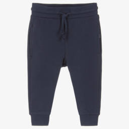 Casual sage green joggers for little boys by Mayoral, made in soft cotton-blend jersey with a warm, fleecy inside. Cosy and comfortable, they have useful side seam pockets and a drawstring waist for a good fit.