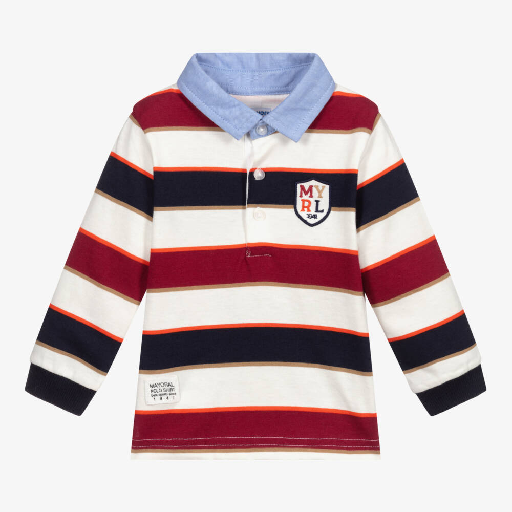 Younger boys long sleeved polo shirt by Mayoral, striped in red, navy blue and ivory. Made in soft cotton jersey, it has a blue Oxford collar and logo patches on the front.