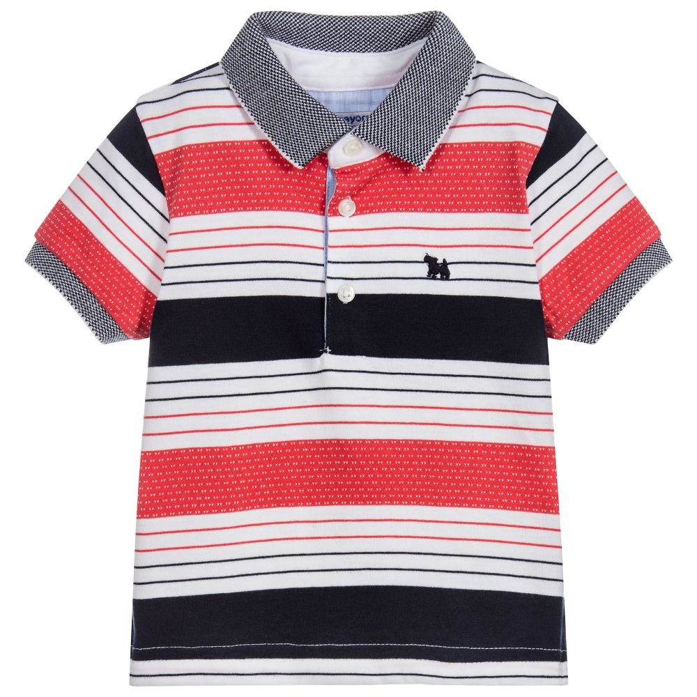 Designed for younger boys, this polo shirt by Mayoral is made in soft and stretchy cotton jersey. With red, white and blue stripes, it has front button fastenings, soft knitted collar and cuffs, and a small embroidered dog on the chest.