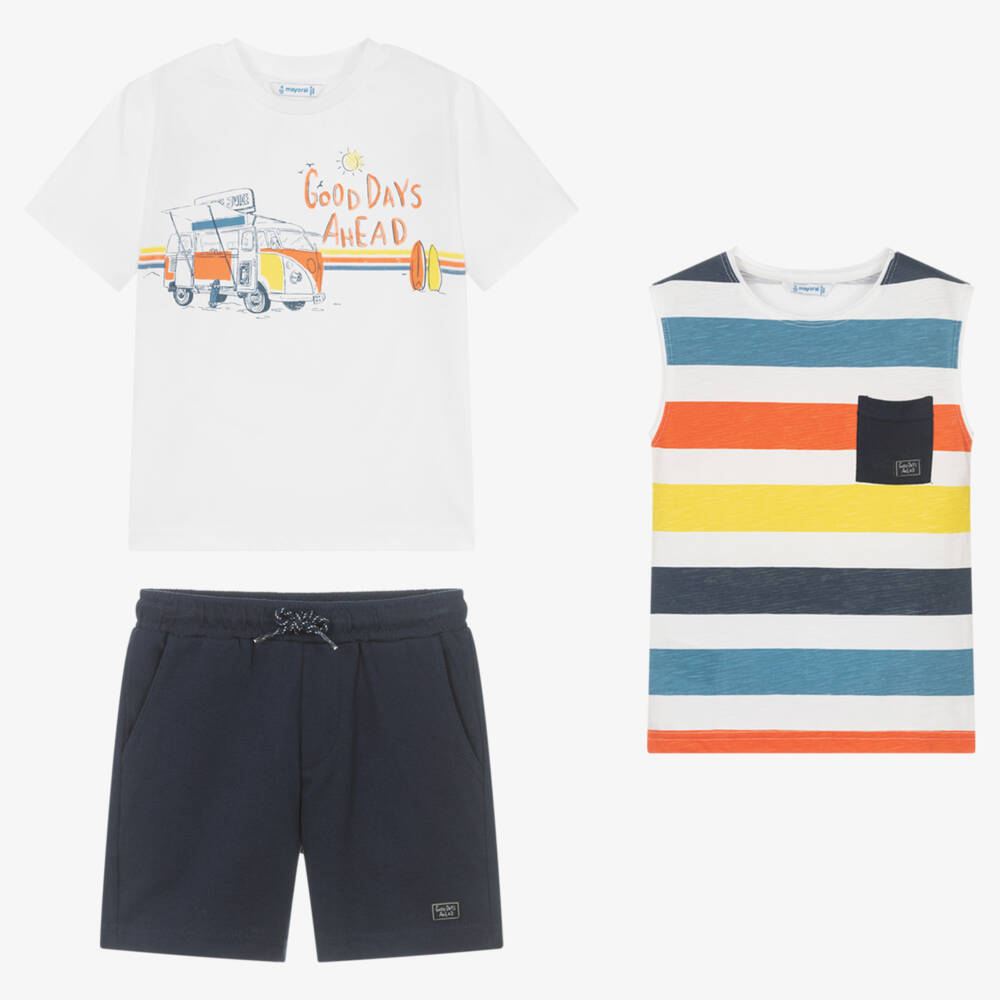 White and navy blue sustainable cotton shorts set by Mayoral. The white T-shirt has a yellow, red and blue striped camper van print on the front complete with a positive slogan. This same slogan is mirrored on the patch pocket of the striped vest. The set is accompanied by navy blue jersey shorts. They have two slanted front pockets and an elasticated drawstring waist, for lasting comfort.