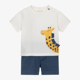 This casual short set for little boys by Mayoral features a playful yellow giraffe on the front. Made in soft cotton jersey, the white T-shirt has fastenings on one shoulder to help with dressing. The navy blue shorts have front patch pockets, faux buttons and a gently elasticated, adjustable waistband for a comfortable fit.