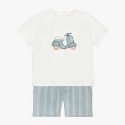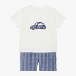 This white and blue short set by Mayoral is a charming outfit for little boys. The soft jersey T-shirt features a delightful car embroidered on the front and a popper fastening on the back. The striped shorts are made in lightweight fabric with front and back pockets and a useful adjustable waistband for a comfortable fit.