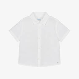 Cool and lightweight, this boys white shirt by Mayoral is made in a slubbed cotton and linen blend. It is ideal for smarter occasions on warm days and has a useful button-fastening pocket on the chest.