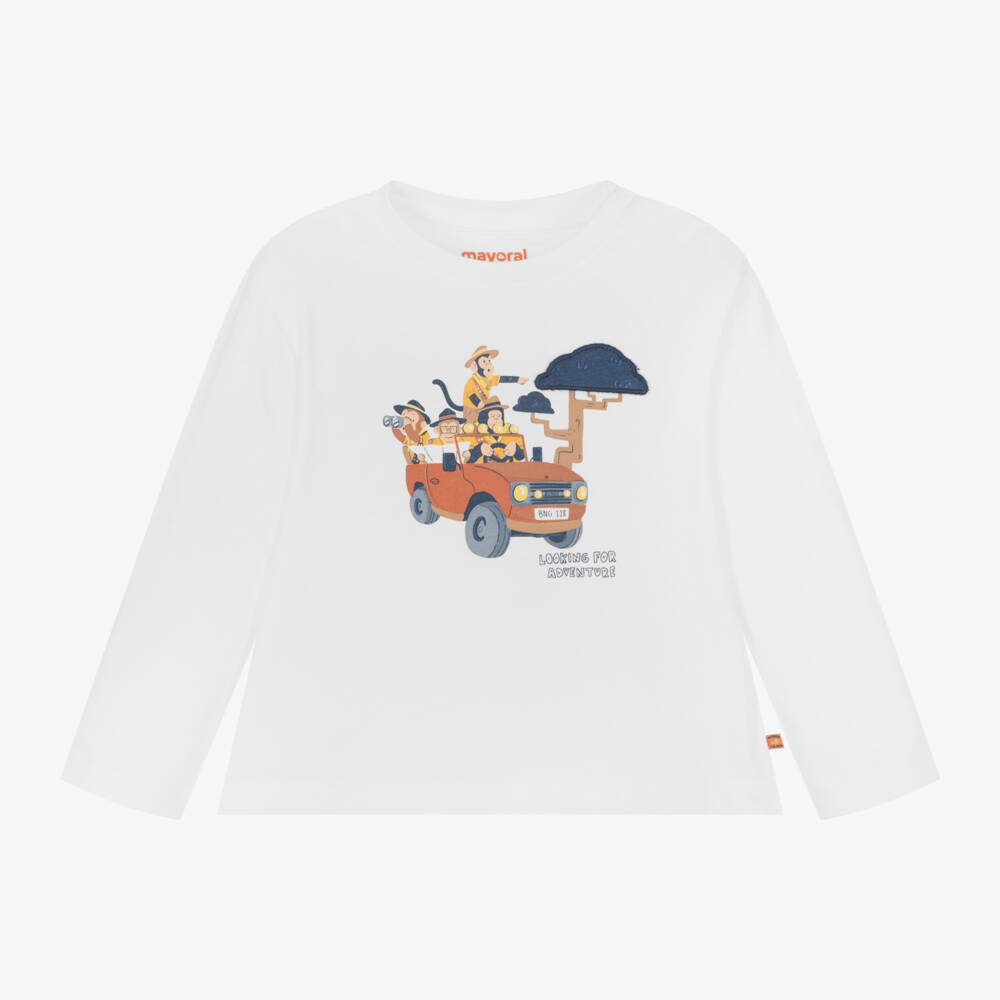 White, long-sleeved cotton top for boys by Spanish brand Mayoral, made in soft, comfortable jersey. On the front it has a fun brown, yellow and blue print of monkeys on safari, with a 'lift-the-flap' tree. There are popper fastenings on one shoulder to make dressing easy.