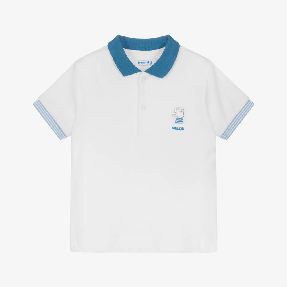 White cotton piqué polo shirt for little boys by Mayoral, with cute sailor dog motifs printed on both the front and back. It has a contrasting blue collar and the ribbed cuffs are tipped with blue stripes.