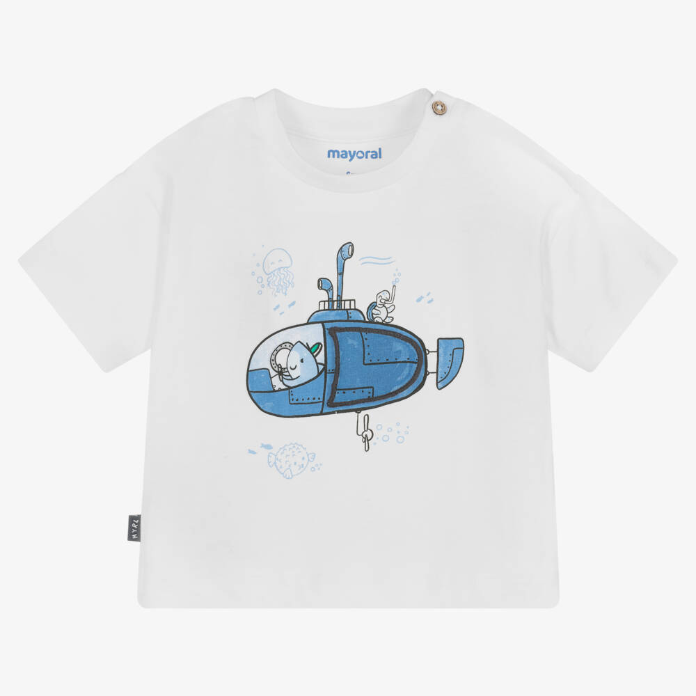 White cotton T-shirt for little boys by Mayoral. It has a blue submarine printed on the front with a lift-up door showing all the animal passengers inside. Ideal for all-day relaxing, it is made in comfortable jersey and has a button with easy-to-use poppers on one shoulder.