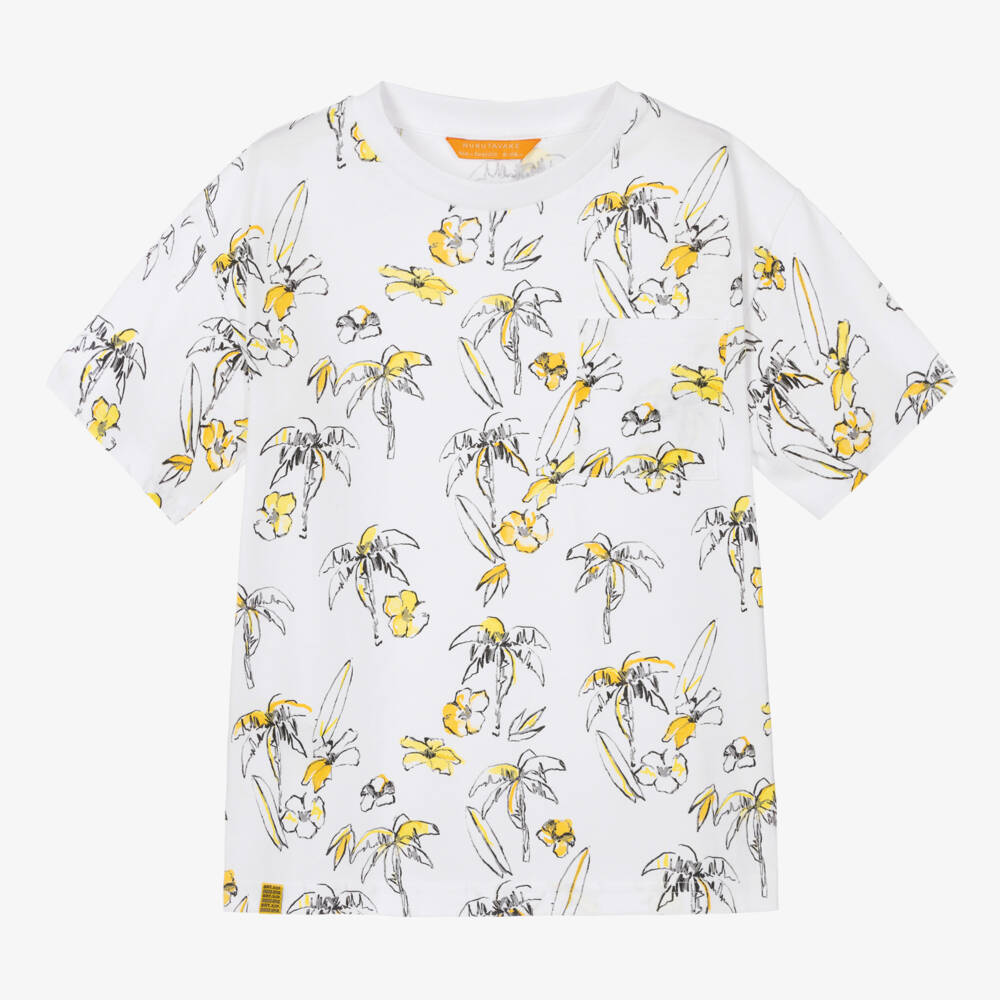 White cotton T-shirt for boys by Mayoral Nukutavake, with a tropical palm tree and flower print in yellow and black. Made in soft and sustainable jersey, this classic tee has a relaxed fit and a useful pocket on the chest.