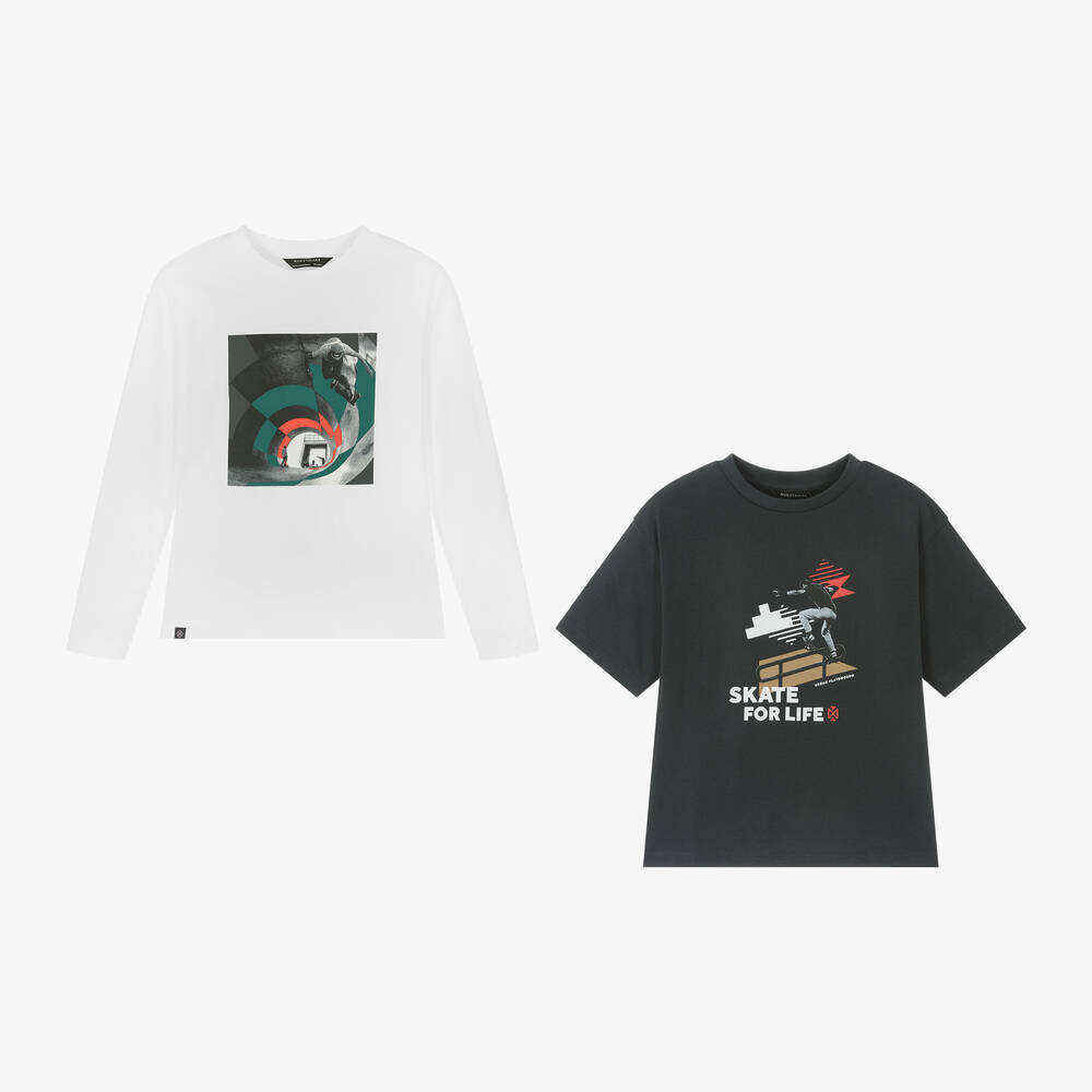 A two-pack of white and grey tops for older boys by Mayoral, made in soft cotton jersey. Both feature skateboarding prints on the front for a cool finish. The white top is long-sleeved whilst the grey is short-sleeved, ideal for layering or expanding their wardrobe staples.