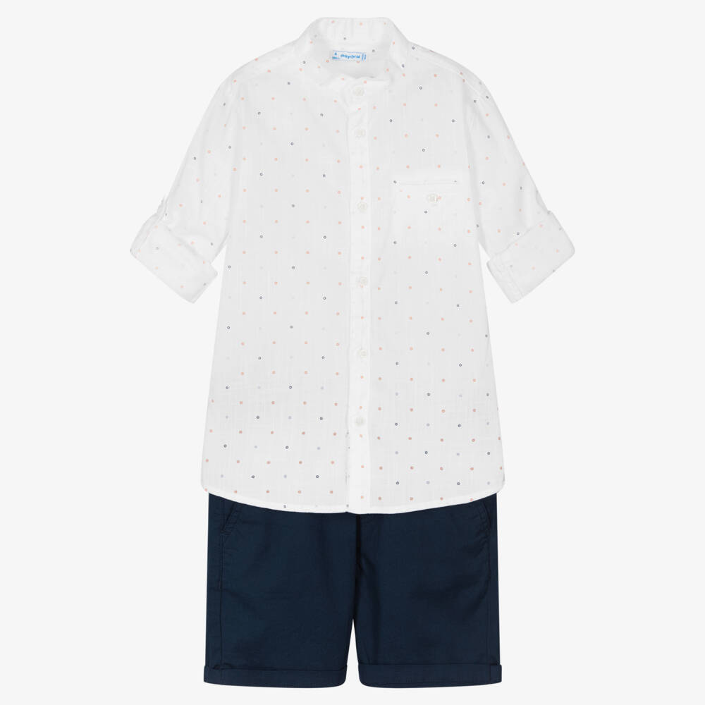 Casual white shirt and navy blue shorts set for boys by Mayoral. Made in lightweight, sustainable cotton, the button-up shirt has a collarless design with a colourful circular pattern. It comes with navy blue twill shorts, styled with four pockets and an elasticated drawstring waist.